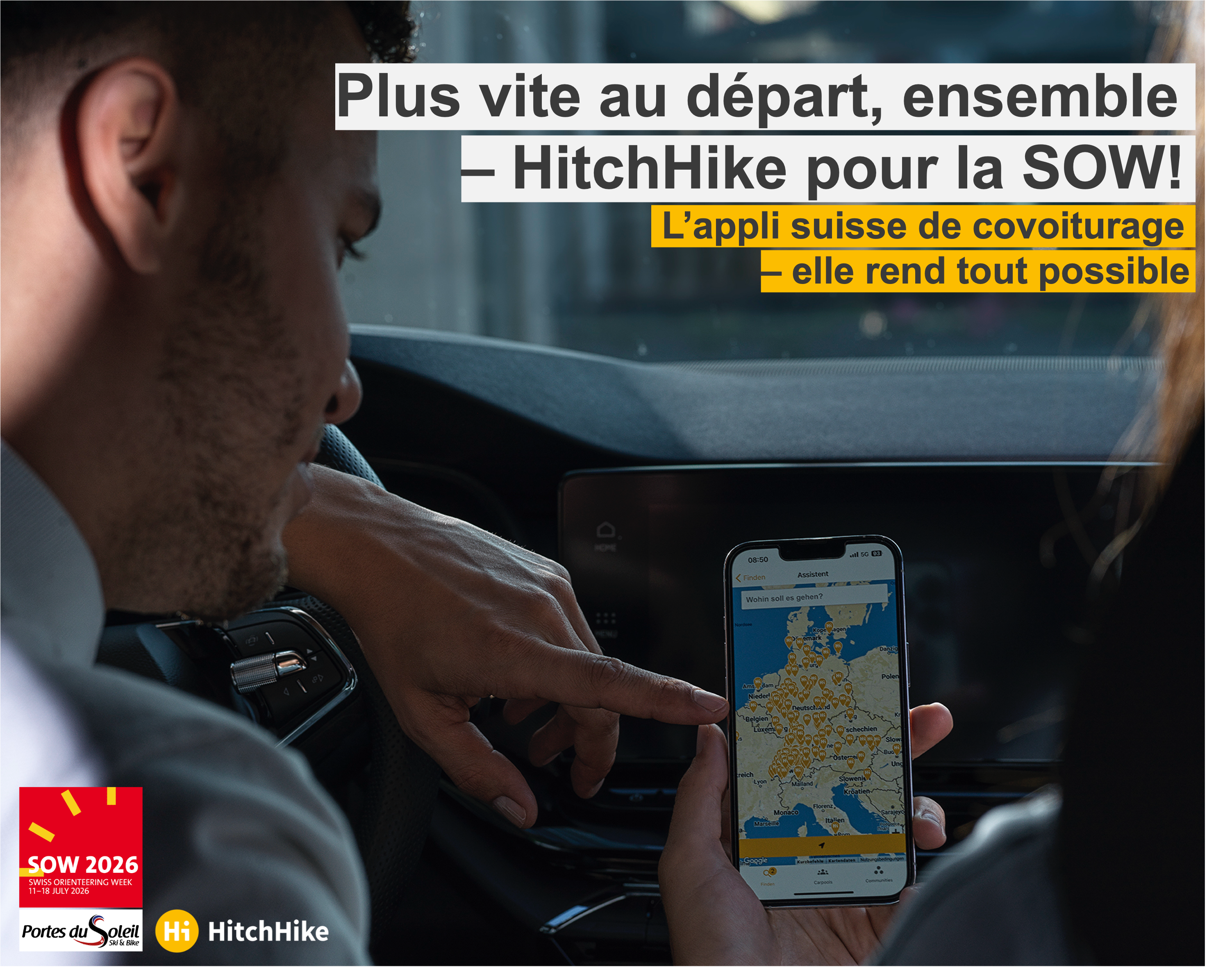 Nous savons tous à quel point les voitures transportent souvent une ou très peu de personnes. Dans le cadre de notre SOW 2026 à Portes du Soleil, nous voulons démontrer qu’une autre approche est possible. Grâce à cette application pratique, il est très facile de former des covoiturages pour se rendre aux différentes étapes. Non seulement cette solution est particulièrement durable, mais grâce à HitchHike, elle est désormais également organisée de manière professionnelle.